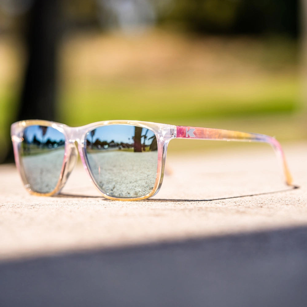Bring a playful, colorful vibe to your look with the Rainbow Sno-Cone Fast Lanes. Iridescent rainbow pastel frames pair perfectly with polarized sky blue lenses, delivering a fun, poolside-ready style while keeping your eyes protected.